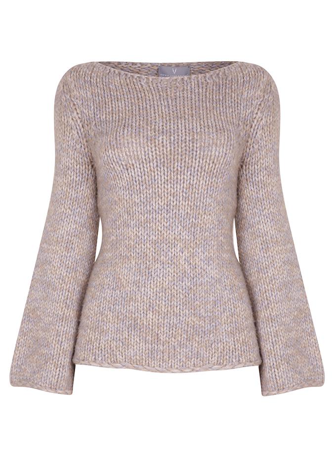 Stylishly super warm, top quality, Italian cashmere boat-neck sweater with fluted sleeves. Available in a stunning water-blue melange yarn.