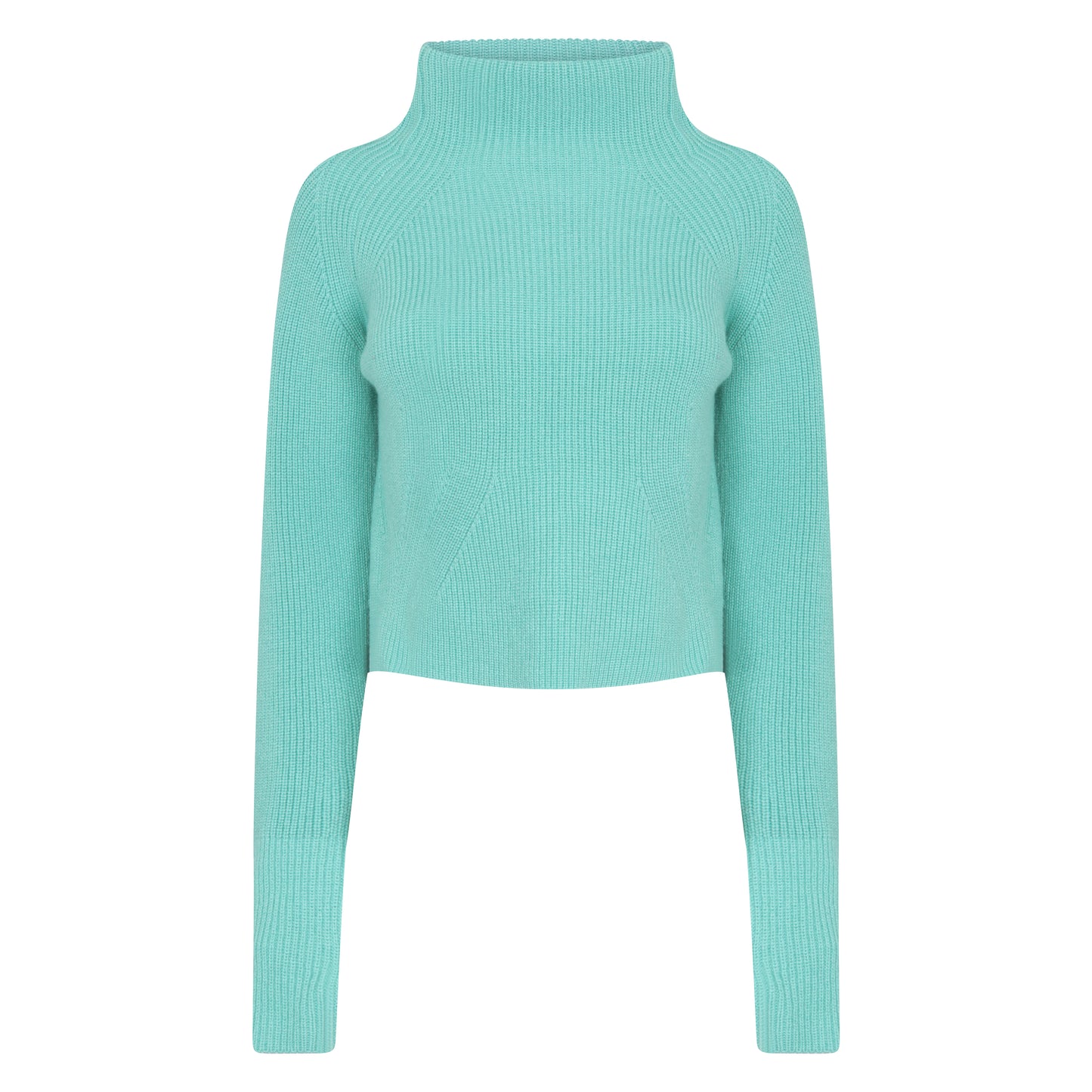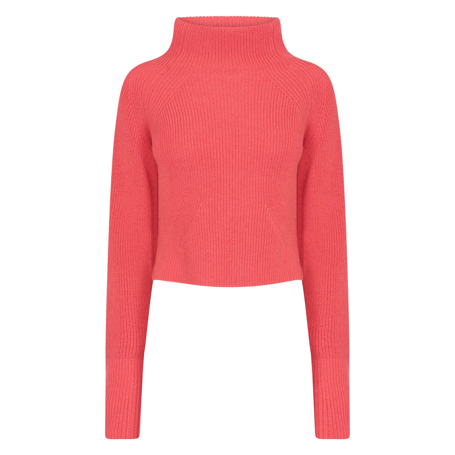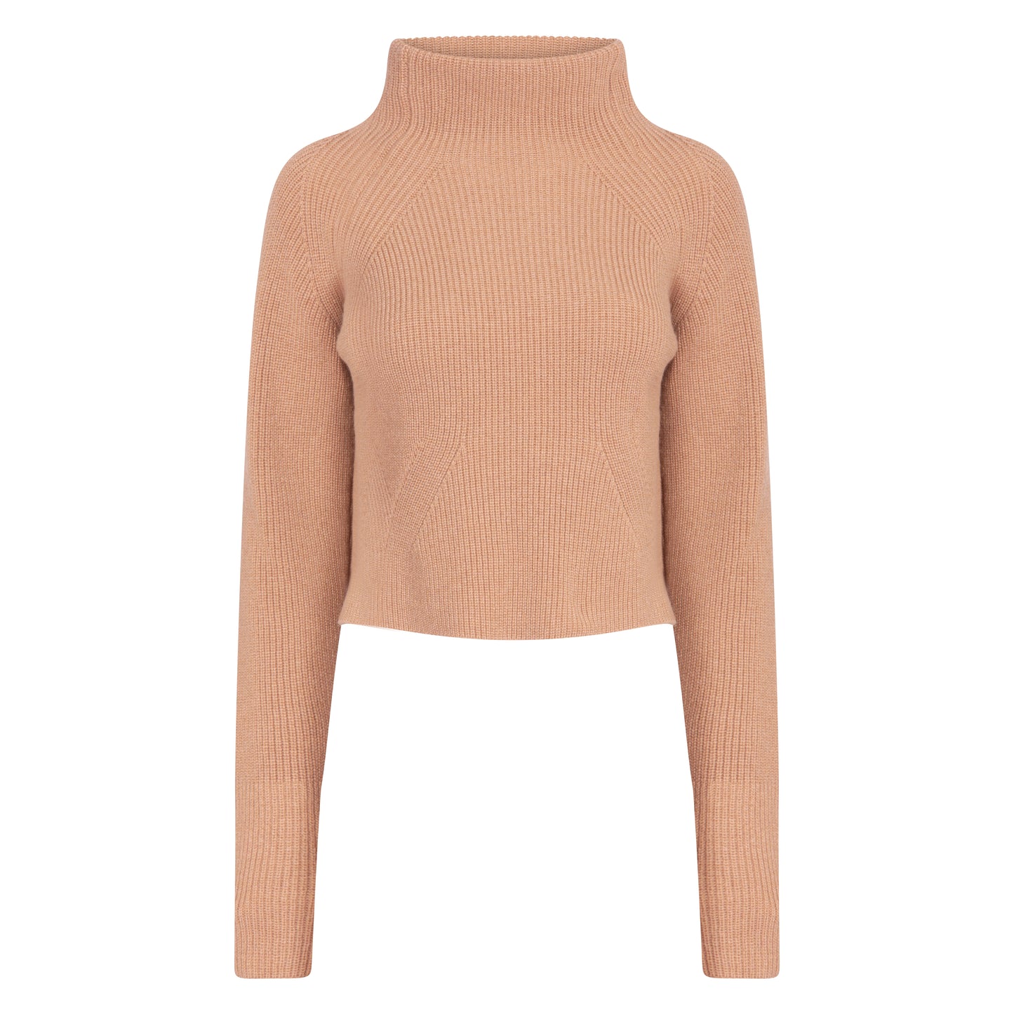 Rib, funnel-neck, crop sweater detailed with lengthened arms and thumb holes to keep hands warm.