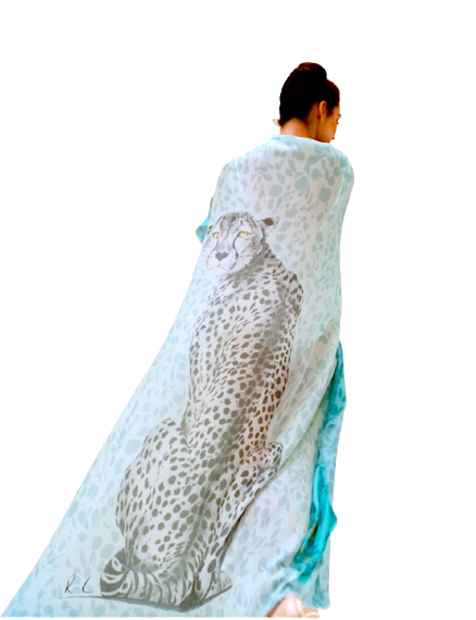 The 'Cheetah Back' scarf-sarong was inspired by wildlife artist, Rose Corcoran's, trip to the Maasai mara. Cheetah’s are officially registered as vulnerable on the IUCN list (International Union for Conservation of Nature).