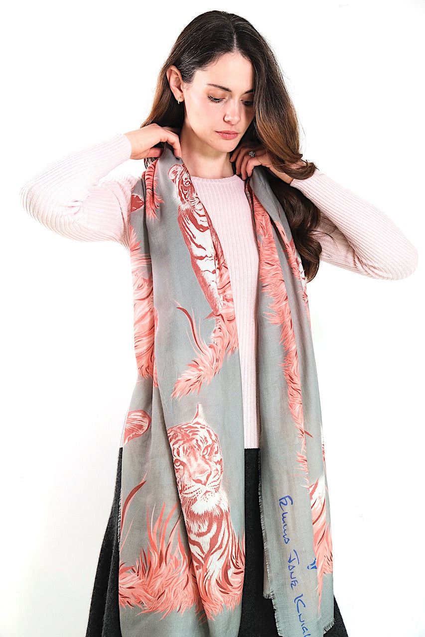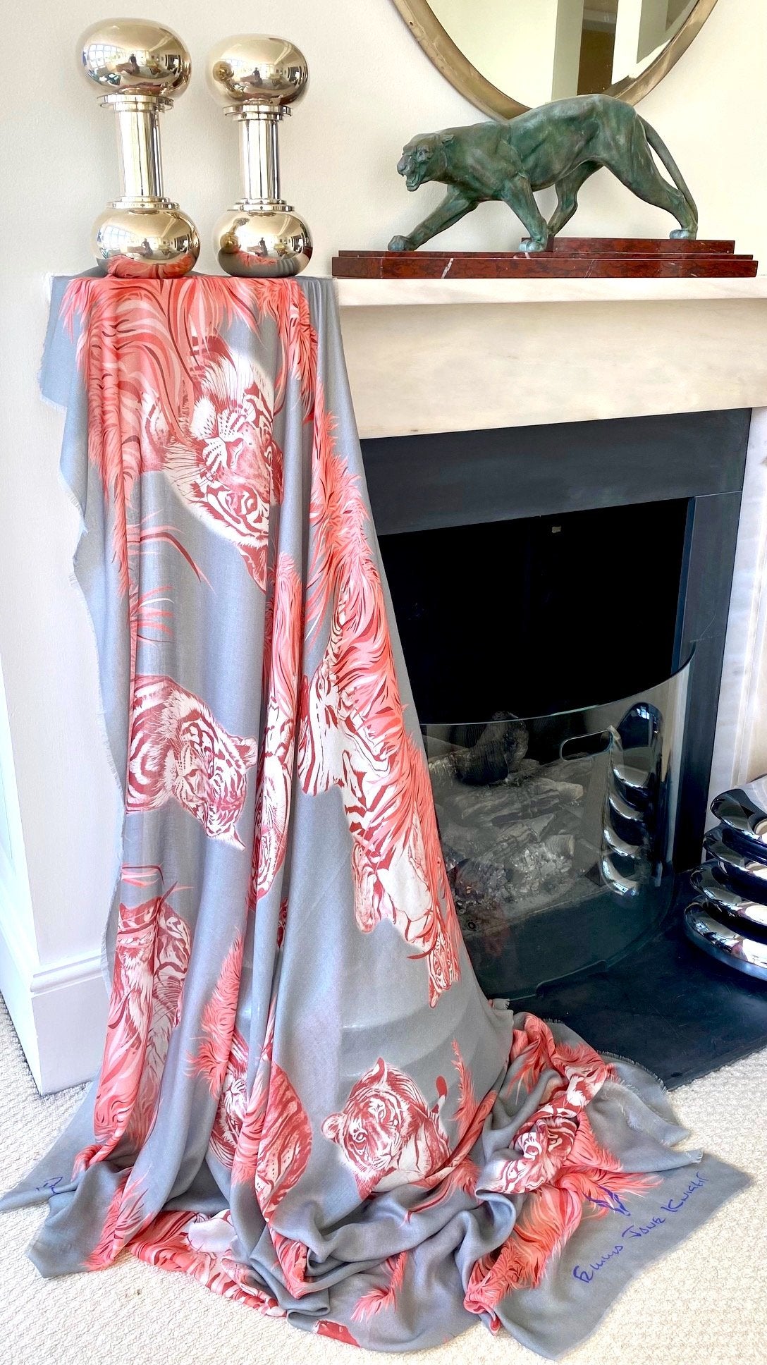 The 'Tigers' scarf-sarong are largely Bengal tigers drawn over the years on Rose's trips to India, largely Madhya Pradesh (central India) and Ranthambhor reserve. Tigers are endangered with around 3,000 Bengal tigers left in the wild.