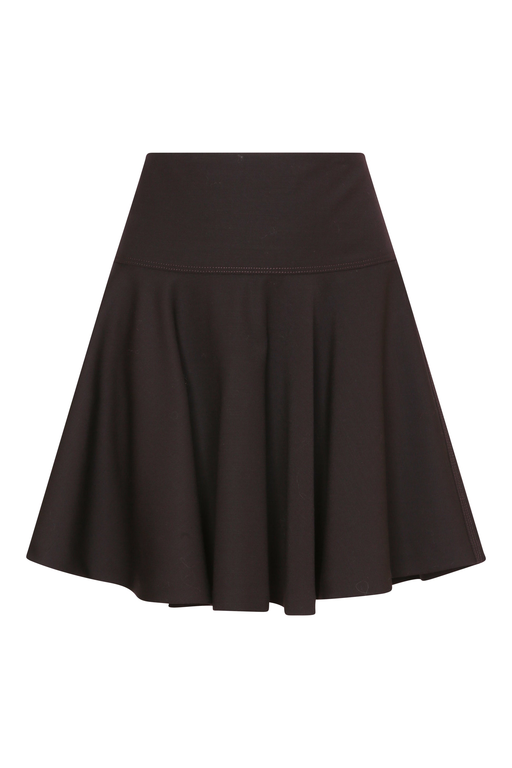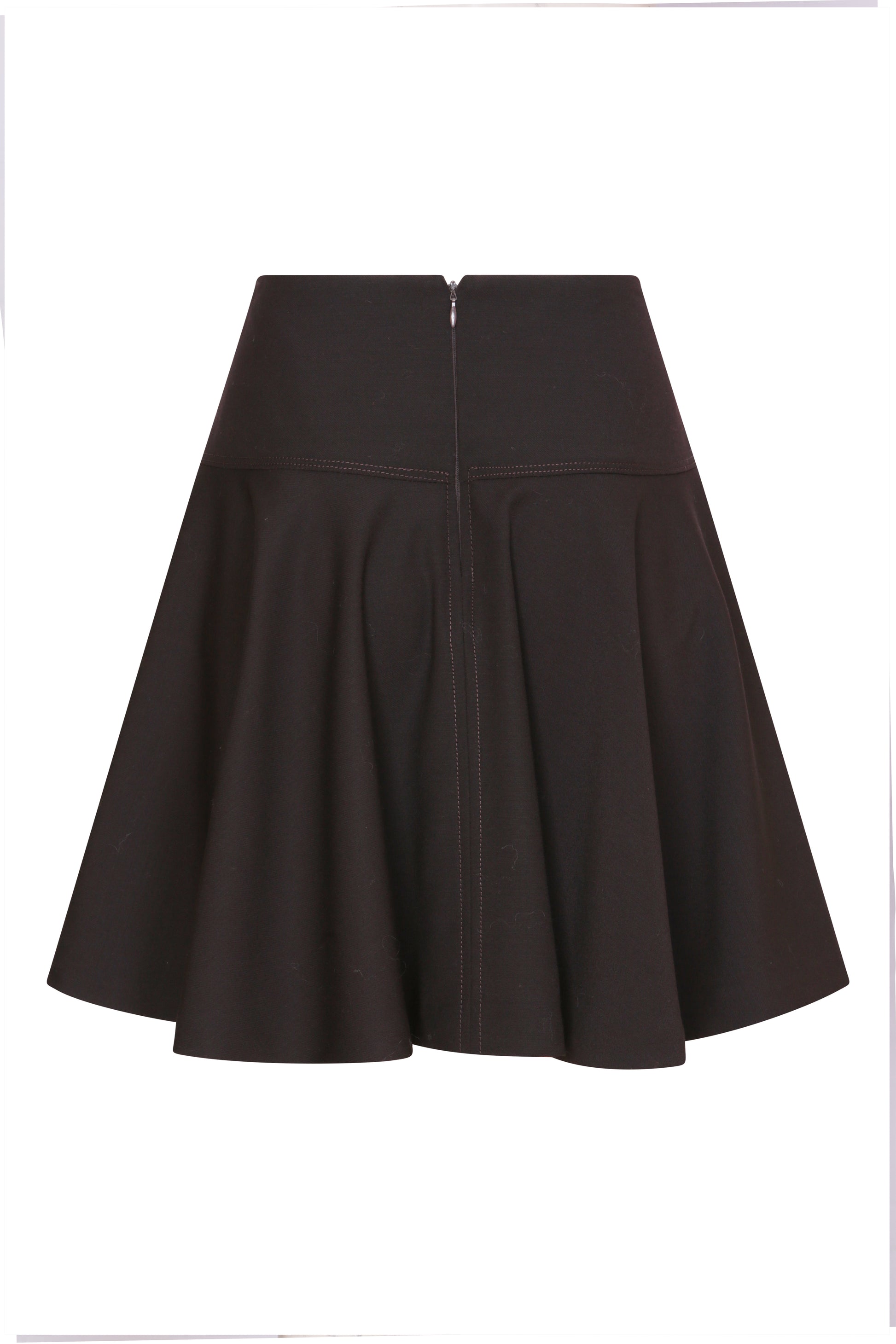The flattering wide panel waist is fastened by a seamless side zip and the skirt flares in to an appealing full circle skirt. The skirt's length may be lengthened or shortened, as you wish.
